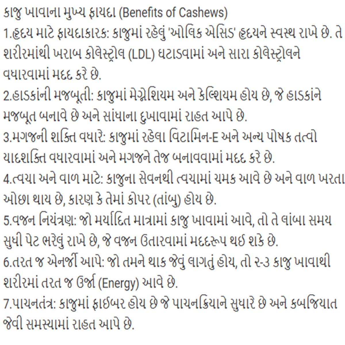 Cashew nuts, known as “kaju,” are nutritious food that has many health benefits. They provide plant-based protein and healthy fats and are a common food choice for vegetarians. Many studies indicate that eating kaju can promote weight loss due to their satiating capacity and high fiber. Cashew nuts (kaju) are also a rich source of antioxidants, which prevent oxidative stress and cellular injury. Kaju may also improve heart health by managing cholesterol levels. Carbohydrates: 36.3 g Protein: 17.4 g Fats: 38.9 g Fiber: 4.1 g Energy: 565 kcal Magnesium: 251 mg Sodium: 5 mg Iron: 5.99 mg Calcium: 42 mg